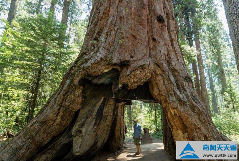 如果一颗树的直径能够一条小路的宽度,就会有这样的效果相比在开头给您介绍的两条腿的树,这棵红杉有气势的多,其高度达315英尺,约96米,下面的“桥洞”的尺寸为:宽6英尺,高9英尺,相当于1.8×2.75米。