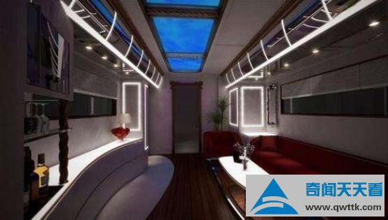 在这款车里面还有一个按钮,这样在车顶就会搭起一个景观阳台。你可以和朋友一起随意喝酒,沿途欣赏到美丽的风景线。在空间设施上应该是应有尽有,例如隐藏式酒吧,空调地暖,配上40寸大电视和多媒体娱乐系统。