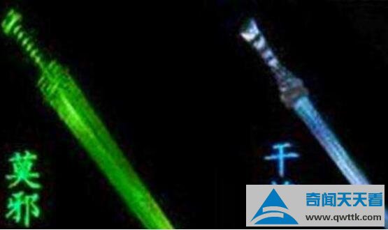 这把刀相信大家比较熟知,它就是古代传说中最具代表性一把名刀。时间追溯到春秋时期,当时楚王对于佩剑十分重视,于是命令国中最好铁匠干将打造一把绝世好剑来。干将在领命后和妻子莫邪,打造出来两把剑,一把叫干将、一把叫莫邪。在献给楚王后认为并不好,于是将他们杀死。后来他们的儿子将父母躯体一起溶于剑中,并将楚王杀死了。