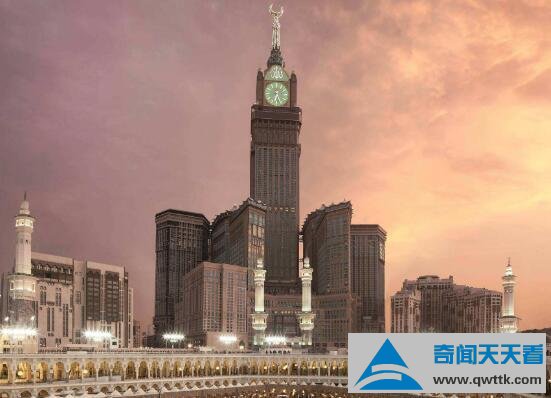 麦加皇家钟塔饭店坐落在沙特伊斯兰教圣城麦加,整座大楼高601米,建筑总面积150万平方米,楼层120。在最顶端用黄金制作一弯新月,距离四百米出建有四面钟,每面钟高80米,宽65米,直径40米,每当节庆日时候就会从钟塔上发射16条彩色光柱,真是绚丽夺目。
