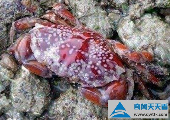 马赛克蟹又叫做绣花脊熟若蟹,体长为4厘米,宽为8厘米,全身长满红白相间网状花纹,分布在水深30米岩石或珊瑚樵中。这种蟹可不要小瞧它,是目前蟹类中最毒一种。研究称它体内含有河豚毒、麻痹性贝毒、海葵毒,这些毒素能毒死45000只小老鼠。