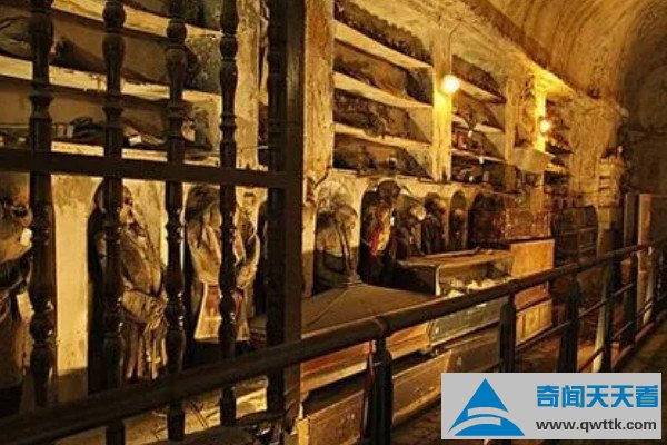 巴勒莫嘉布遣会修士地下墓穴位于意大利西西里岛,在这一墓穴的墙壁上悬挂和陈列着8000具木乃伊尸体,这些木乃伊尸体穿着昂贵的衣服,脖颈和脚都被吊钩悬挂,就是像是在默默祈祷,另外木乃伊的尸体摆放姿态不同,被评为为世界十大古墓稀世珍宝之一。