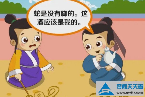 其中有个人画的很快,一转眼就画好了,他便准备端起酒来喝,但他回头看别人都没画好,还洋洋得意地说:“你们画得好慢啊!我再给蛇画几只脚也不算晚呢!”于是,他左手提着酒壶,右手给蛇画起脚来,与此同时,另一个人也画好了,便抢过了酒壶,嘲笑他蛇是没有脚的,说完便仰起头将酒全部喝了下去。