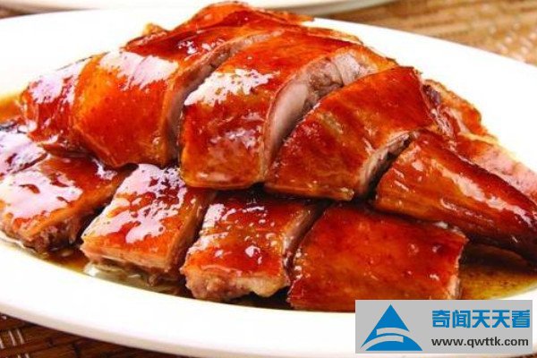 烧鹅是广东菜系中的特色,是广州传统烧烤中的肉食,源自于烤鸭,它看上去色泽金红,吃起来味美可口,早在民国二十八年就已经名扬海外,以整鹅去翅和头烤制而成,滋味醇厚。