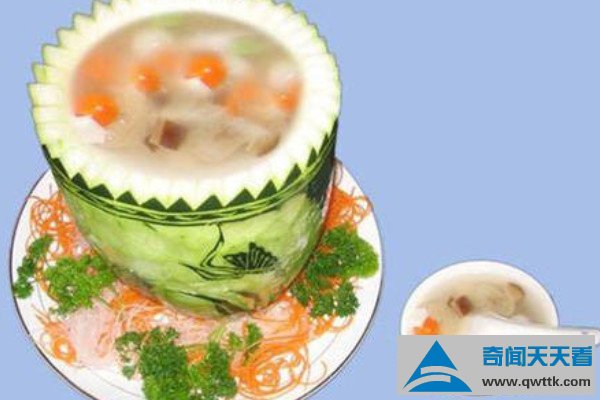 什锦冬瓜帽是广东一道传统名菜,它属于粤菜系,以冬瓜和猪肉为主要原料制作而成,它适合脾胃虚寒、阳气不足的人群食用,制作时以老熟的冬瓜为最佳食材。