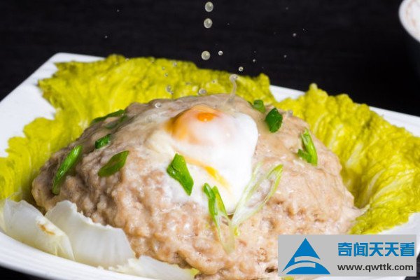 咸蛋蒸肉饼是广东传统的特色名点,它将咸鸭蛋和猪肉糜拌在一起,然后蒸成肉饼,散发出特别的咸香味,其中具有各种矿物质以及微量元素,对骨骼发育很有帮助,还能预防贫血。
