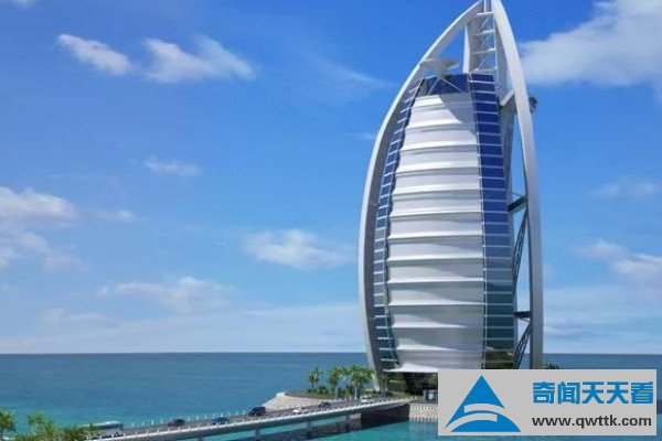 迪拜帆船酒店的高度为321米,一共有56层,建在离沙滩岸边280米远的波斯湾内人工岛上,顶部设有一个停机坪。据说在迪拜种植一棵树就要花费3000美元以上,其中有多个世界上最贵的酒店,奔驰在这里当警车用,金银首饰是每个女人的必备品,还有全球最贵族化的运动。