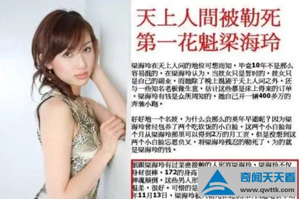 天上人间是一个娱乐场所,这里将富丽堂皇展现的淋漓尽致,而梁海玲就曾经是天上人间的头牌人物,后来残忍地被杀害,今天就和小编去详细了解一下天上人间头牌梁海玲的经历吧。