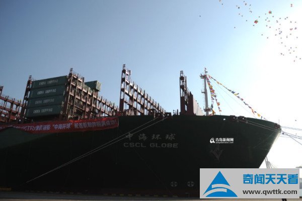 中海环球号货轮是2014年度世界上最大、最先进的集装箱船,同时也是中国海运集团订制的5艘19100 TEU型集装箱船中的首条船,该船全长400米,宽度约为60米,整个船体的大小超过4个标准足球场,船身的长度比美国海军“尼米兹”号航空母舰还要多出67米,堪称“海上巨物”。