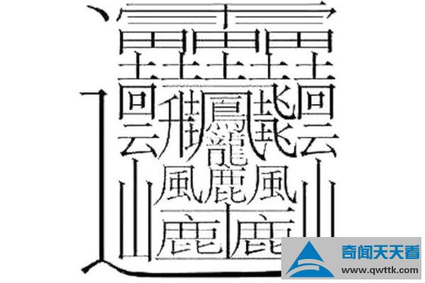 172画的汉字与其说是字,不如说是一幅画,也有人称它为一道符,首先从这个字的结构上来看,由一个雨、一个鳯、一个龍、两个四云、两个山、两个风、三个田,三个鹿、六个土代指雷电等诸多字体所组成,可以理解成霹雳惊雷,云波诡谲,龙凤飞升,大势将起,风啸山林,逐鹿中原。