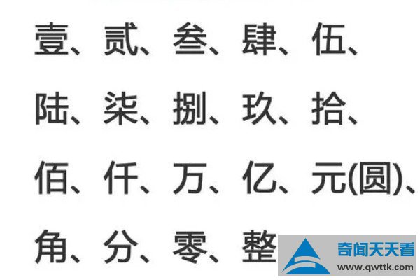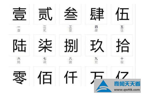 大写的一二三四五六七八大九十分别是壹、贰、叁、肆、伍、陆、柒、捌、玖、拾,该写法始于明朝,因重大贪污案“郭恒案”而发布的新法令,其作用就是增加了改写账本的难度,即不容易做假账,而后这套做账规则一直沿用至今,注意“佰、仟”一开始的写法为“陌”和“阡”。