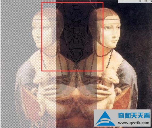 同样是将《抱银鼠的女子》给镜像,在上图红框框中,我们可以看到一副外星人的简笔画,与岩间圣母的外星人模样极为神似。