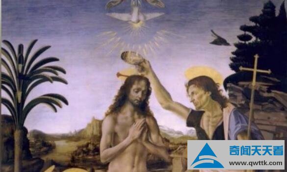 在《圣施洗约翰》中也不例外,将其镜像一下就会得到这样一个古怪的画面,完全是一副外星生物的模样,其头上发光的东西,则有可能是飞碟。仔细看,你会发现,这些外星人的长相十分的相似,很可能是同一种外星人。