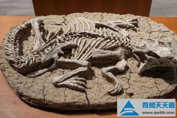 这块化石是若干年前美国古生物学家在蒙古发现的,由15只原角幼龙组成的洞穴,距今已有7000万年,根据研究表明幼龙出生后需要在洞穴中生活很长时间。