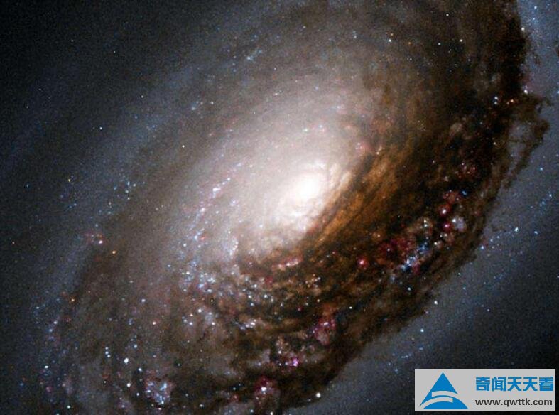 无数明亮的恒星和黑色尘埃点缀期间,大片星际气体围绕中心形成螺旋臂。这些螺旋臂上分布着无数蓝色恒星,恒星之间点缀着黑色星际尘埃带。